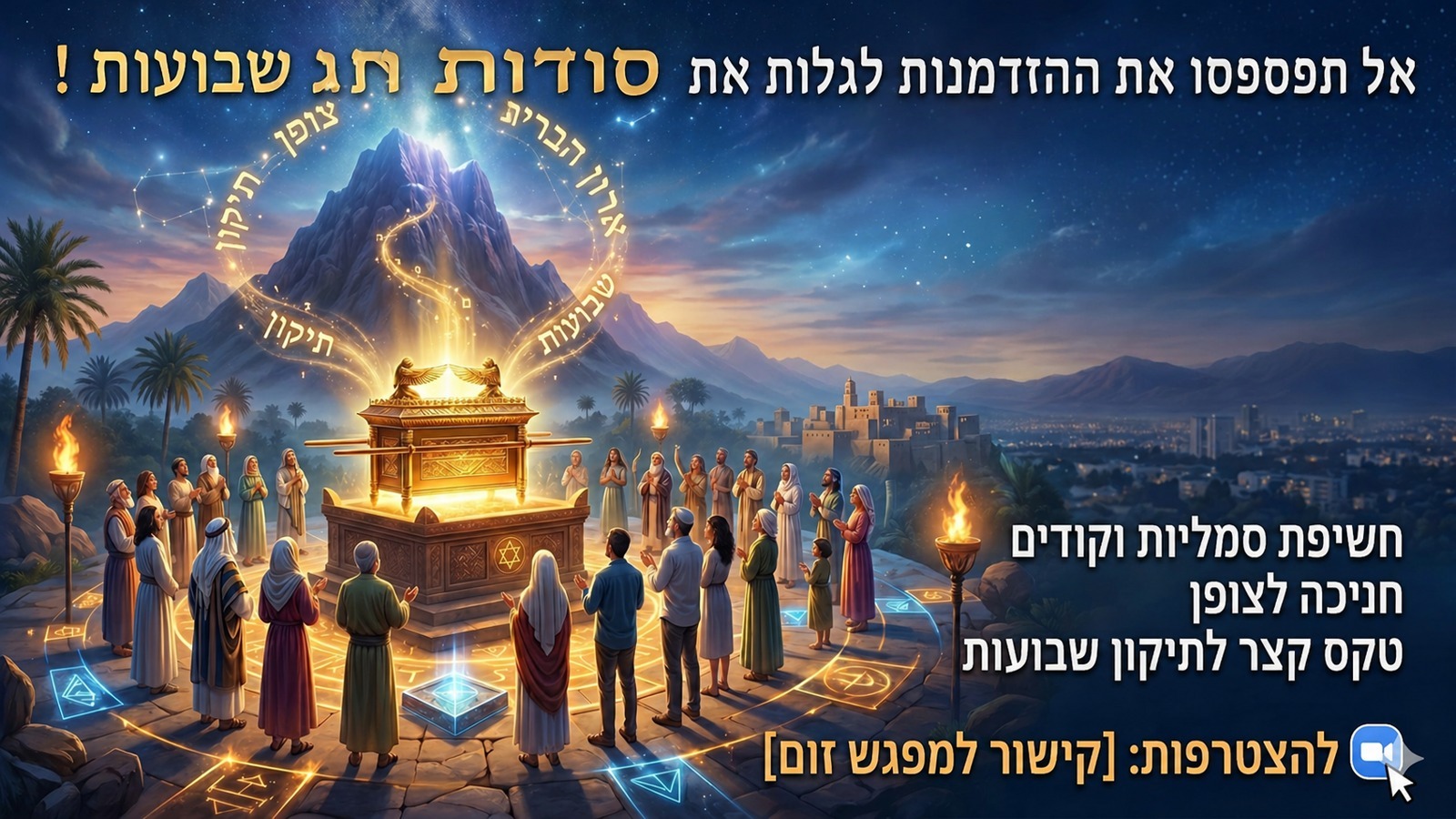 רוצות ורוצים לגלות את הסודות העתיקים של חג שבועות? הצטרפו אלי למפגש זום ייחודי ומרתק , בו נצלול אל תוך הסודות והמשמעויות העמוקות של חג מתן …